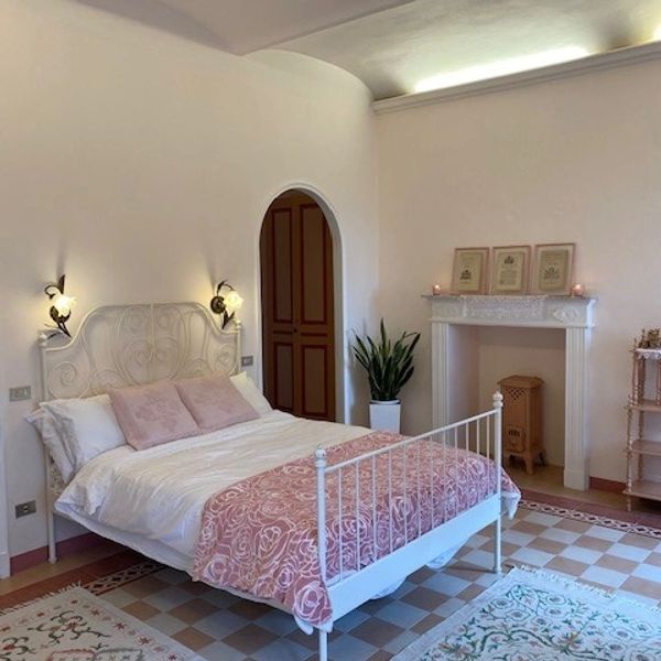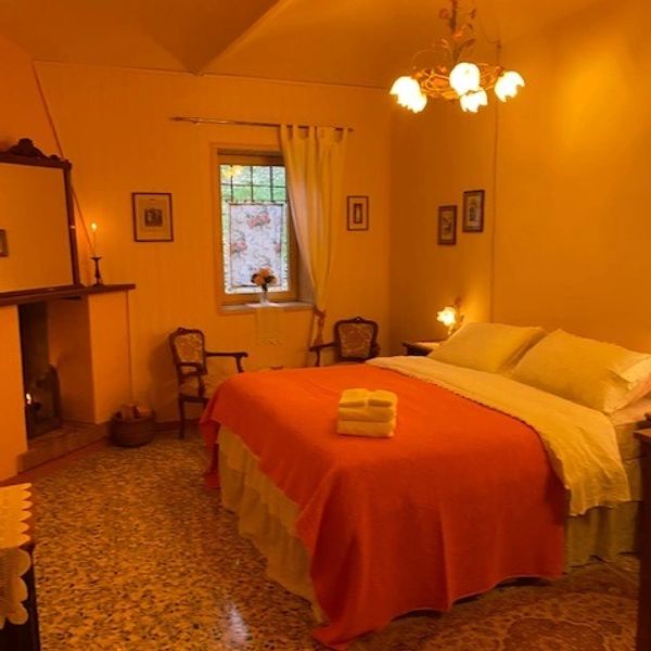 Beautiful double room with working wood-burning fireplace, vestibule and large private bathroom. Cozy and romantic, it is also furnished with period furniture. Like roses, it displays beautiful colors and atmosphere. (Equipped with safe) €120 per night